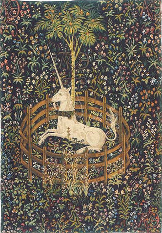 The Hunt of the Unicorn Tapestries were woven in Brussels between 1495 and 1505 in a wool and silk weave with gilt and silver threads. The Captive Unicorn tapestry shows the magical unicorn in anallegorical setting expressing purity and fertility, Christian and human love. The unicorn (representing purity) is attached by a golden chain to a pomegranate tree (fertility). The A and reversed E might refer to Anne of Brittany. They are displayed today at the Metropolitan Cloisters in New York.