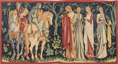 The Knights Depart tapestry is a cotton version of the full high quality wool and cotton tapestry The Departure of the Knights which has a stylized border. You can also select two halves of the full fine tapestry, The Knights and the Ladies of Camelot, which form a matching pair of wall tapestries.
