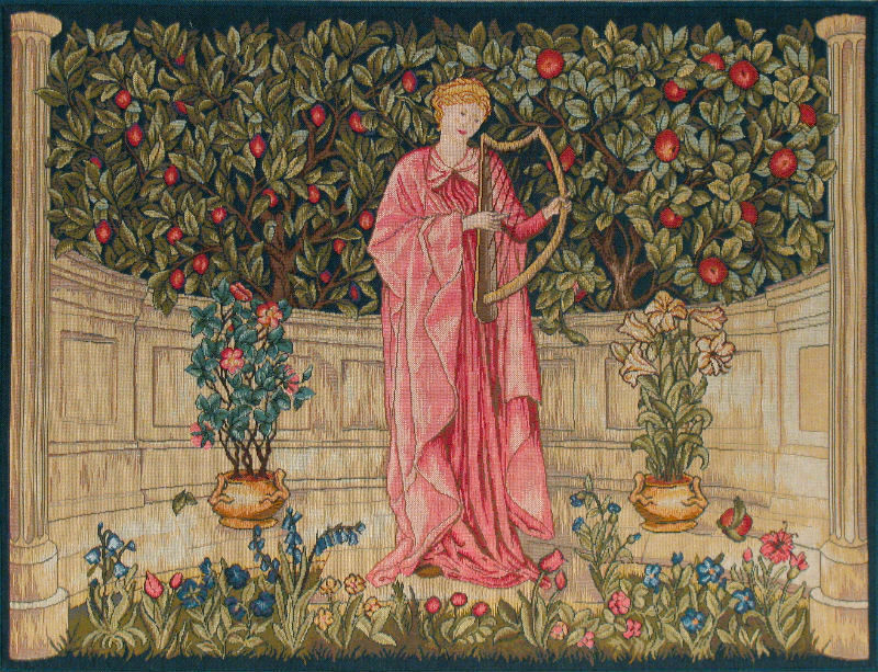 The Minstrel tapestry was designed by Morris & Co in 1899 for display above a fireplace. It shows a musician in a garden, a figure dressed in a long pink robe playing a lute in an alcove. Typical of Morris's work the background contains a great deal of detail with leaves and fruit trees. This version of this French-woven tapestry is without a border and it is lined with a rod pocket for easy of hanging.