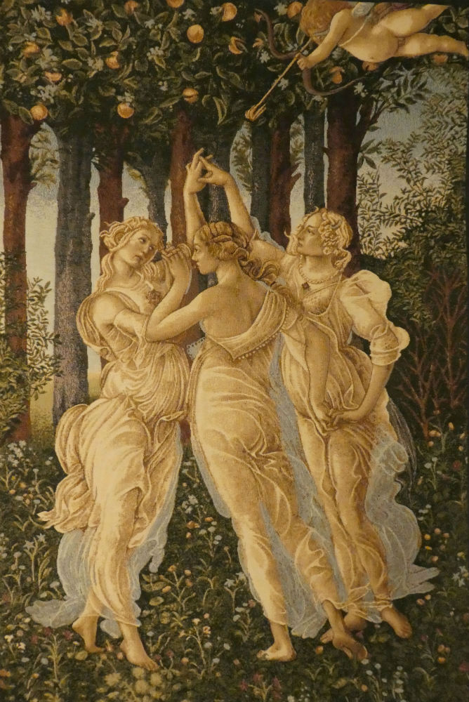 The Three Graces tapestry shows a detail from the painting Primavera by Sandro Botticelli (1445-1510). Botticelli painted this evocation of Spring in late 1470 or early 1480. It now hangs in the delightful Uffizi Gallery in Florence. The Three Graces, sisters, hold hands in a dance in the left of the painting.