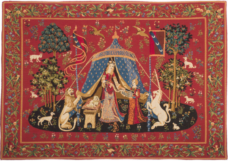 To My Sole Desire tapestry is, in one English translation, a version of the A Mon Seul Desir tapestry hanging in the Cluny Museum. The best known of the 15th century Lady with the Unicorn tapestries, this is generally seen as the key piece in the series depicting the senses. We appreciate the fact that this is so enigmatic with many things not known about these medieval tapestry masterpieces.