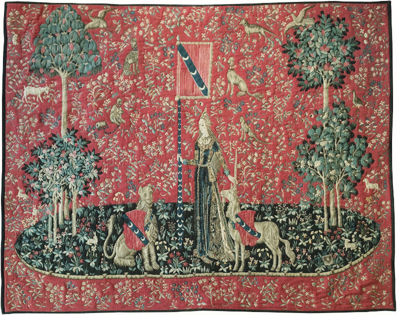 You may find it helpful to know that three other Lady with the Unicorn tapestries match the above tapestry being from the same weavers and in the same or very similar weaves:-