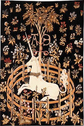 This is a small simpler version of the Unicorn in Captivity tapestry now in the Metropolitan Cloisters - the seventh in the Hunt for the Unicorn series. It shows the resurrected Christ against a milles fleurs background. This unicorn tapestry wall hanging is woven in France woven today in 97% cotton and it is lined, with a rod pocket. We enclose information about how to hang a tapestry with your order.