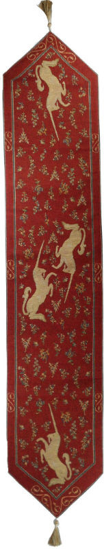 The Unicorns table runner shows unicorns taken from the medieval Lady with the Unicorn tapestries, surrounded by mille fleurs florets on a red background. There is also a shorter size of this table runner with one pair of unicorns whereas the longer has two pairs. Both are woven in France and are lined with the tassels at each end (the shorter size image below omits these though they are included). Also see the matching designs: A Mon Seul Desir, Orange Trees, and Rabbits table runners. We are introducing the beautiful Unicorn and Rabbits Bellpull - Unicorn and the Rabbits Bell Pull - The Tapestry House - Jacquard Woven Tapestries