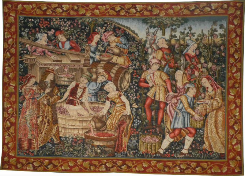 The Vendange tapestry is inspired by the original Vendanges wall hanging that was woven in Flanders around 1500 and is currently on display at the Cluny Museum in France. It is typical of the noble daily life theme found in the tapestries of the 15th century. The Lord and Lady are shown overseeing the grape harvest and the pressing of the grapes. Everyone, including the servants, wears the finest clothing and jewellery! This scene represents the two techniques of pressing known in the Middle Ages: pressing with the foot, where the peasant tramples the grain to crush it (a technique used for the not very important vines), and the press with screw which the peasants turn with a stick to crush the bunches and to extract the juice from them. The liquid is then collected in wooden barrels to be preserved.
