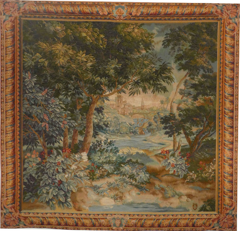 Verdure Cascade tapestry was originally woven in Lille in the early 18th century, a classic French verdure tapestry featuring a landscape scene with floral details. In the foreground we see part of a small river with flowers and foliage. In the background there's a distant French town lost in the haze. These elements, combined with the tree in the middle ground, create a sense of depth.