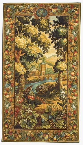 Verdure Hautil - a fine French wall tapestry of a woodland scene of a church and a bridge viewed through the forest trees. In the foreground there are wild flowers are in bloom. It is one half of Verdure Chantilly (the other half being Verdure Meudon). The border of this piece is beautifully rendered with ripened fruits including grapes, apples, plums, and pears gracefully entwined around the piece. This superb French wall tapestry, woven by Jules Pansu in 95% cotton and is lined and has a tunnel for ease of hanging - we provide tapestry hanging instructions with your order. Please note that it is non-returnable.