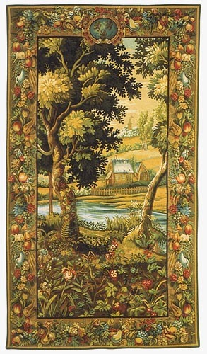 Verdure Meudon tapestry is one half of the Verdure Chantilly tapestry (the other half being Verdure Hautil), originally woven in Beauvais in the early 18th century. It has a woodland scene of a cottage viewed through the forest trees. The cottage has a picket fence and there are wild flowers and a meandering stream in the foreground. The border of this piece has ripened fruits including grapes, apples, plums, and pears gracefully entwined around the piece. This very fine quality French tapestry, woven by Jules Pansu in 94% cotton and is lined and has a rod tunnel. We enclose information about how to hang a tapestry with your order. Please note that it is non-returnable.