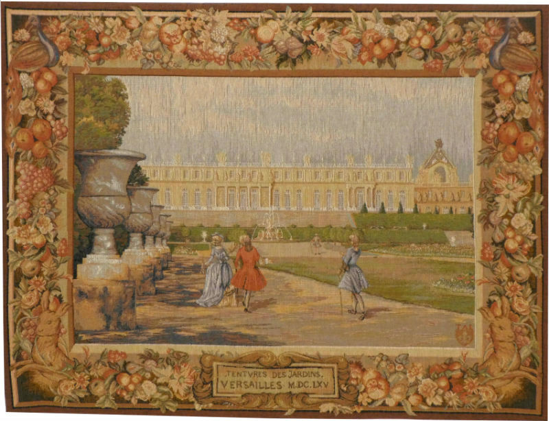 This smaller version of the Versailles Promenade tapestry is inspired by The Tapestries of the Royal Households, commissioned by Louis XIV in about 1670. They were woven at the Royal Gobelins workshops in Paris. This tapestry is finely woven in France in a high quality wool and cotton blend. It is lined with a rod pocket - we provide information about hanging tapestries with each order.