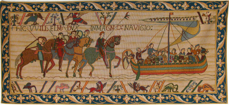 Today's reproductions of The Bayeux Tapestry are woven by several French and Belgian weavers. The tapestry names listed below match the above tapestry having the same yarns and colour tones. This list is useful when hanging matching Bayeux tapestries together. William Embarks, no border- King Harold tapestry- King Harold, no border - Duke William's Cavalry -Duke William's Cavalry, no border - Duke William's Ships - Duke William's Ships, no border - Bayeux Tapestry - Saxon ship