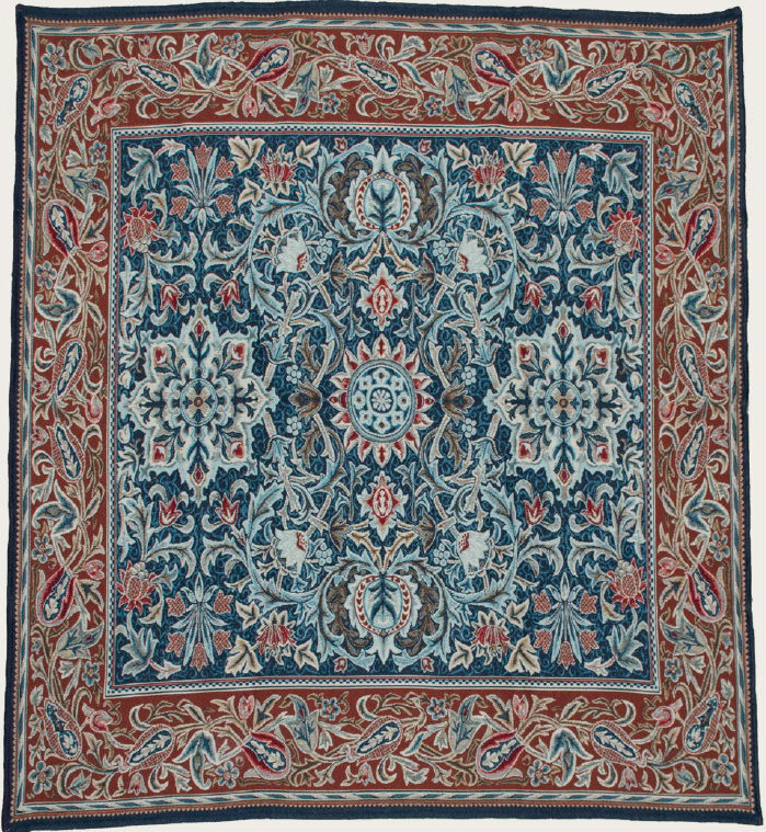 The William Morris Essex throw has a typical swirling design from this Arts and Crafts designer. The rust-colour of the border backgrounds surrounds greens-blues woven softly.