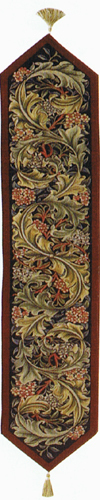 It is available in two colour options (see the Morris table runner with a dark green background) - this one with a burgundy edging. The table runner is lined, with tassels at either end (the length shown includes the tassels).