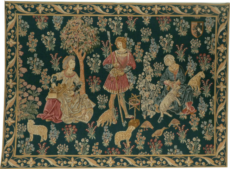 Woolworkers tapestry is typical of 15th century French tapestries. The mille fleurs (thousand flowers) background was commonly used by medieval weavers in the Loire valley. We see carding and shearing in this pastoral scene. This medieval tapestry is now woven in France in two sizes, available with or without the deep blue border. It is lined and has a rod pocket for easy hanging - we provide tapestry hanging information with each order.